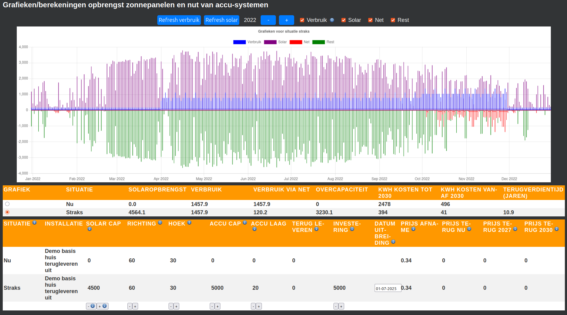 | Grafiek | Situatie | Solaropbrengst | Verbruik | Verbruik via het net | Terug naar het net | Overcapaciteit | kWh kosten tot 2030 | kWh kosten vanaf 2030 | Terugverdientijd (jaren) |