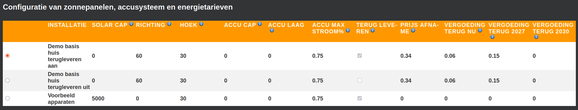 | Installatie | Solar cap | Richting | Hoek | Accu cap | Accu laag % | Accu max stroom % | Max ampere terug | Prijs afname | Vergoeding terug nu | Vergoeding terug 2027 | Vergoeding terug 2030 |