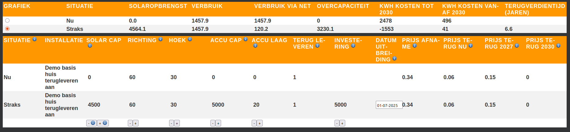 | Situatie | Solar cap | Richting | Hoek | Accu cap | Accu laag % | Max ampere terug | Investering | Datum uitbreiding | Prijs afname | Prijs terug nu | Prijs terug 2027 | Prijs terug 2030 |