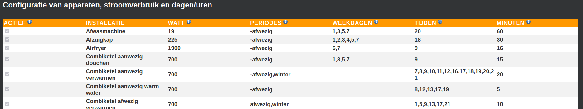 | Actief | Omschrijving | Watt nom | Watt max | Tijdvakken | Weekdagen | Tijden | Minuten |