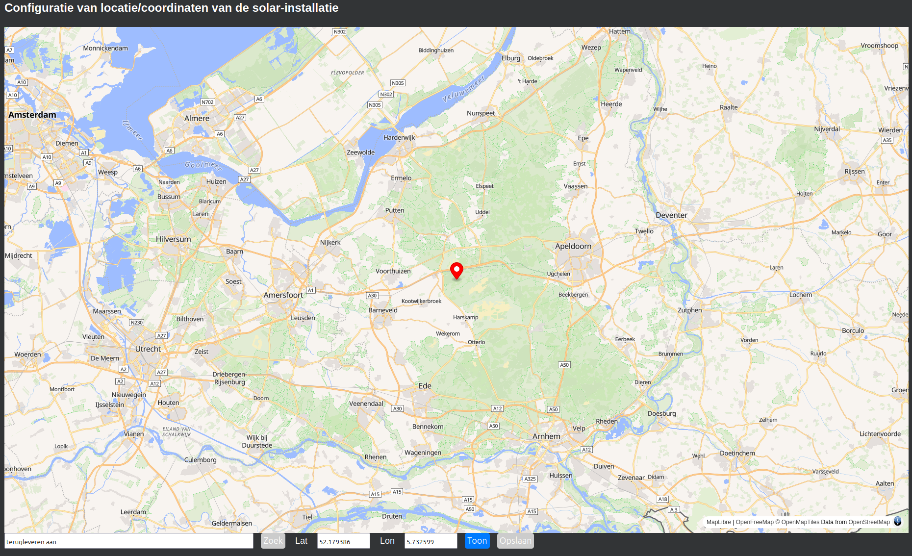 De latitude en longitude bepalen de coördinaten waarop de verwachte solar-opbrengst is gebaseerd.